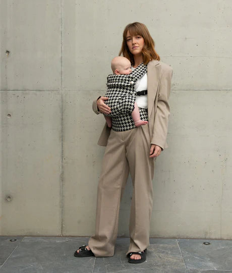 O tecido estruturado com padronagem Houndstooth transforma o porta-bebê em um acessório de moda, elevando instantaneamente qualquer look — você se sente bonita até nos dias mais simples.